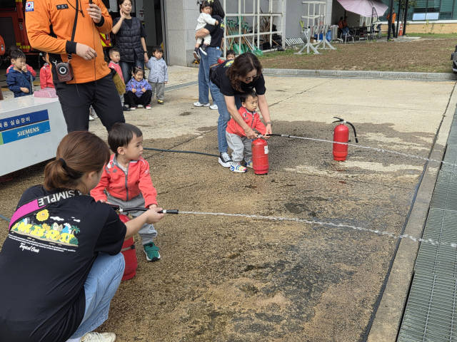 아이들은 소방차 종류와 역할에 대한 설명을 듣고 직접 소방차에 탑승해보는 시간을 가졌으며, 소화기 사용법을 배우고 물 소화기 체험을 통해 실제 화재 진압 과정을 간접적으로 경험했다.