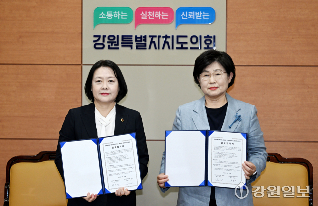 박윤미 강원자치도의회 고령친화도시연구회장(왼쪽)과 최경순 고령사회를 이롭게하는 강원여성회장이 15일 도의회 상담실에서 고령친화사회 조성 및 관련 정책 연구 협력을 위한 업무협약을 체결하고 있다. 박승선기자