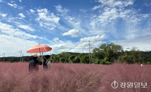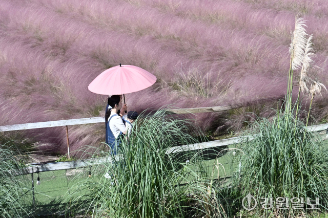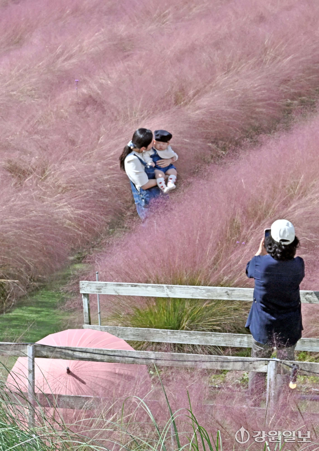 오랜만에 맑은 날씨를 보인 15일 춘천시 신북읍 지내리에서 한 가족이 핑크뮬리와 함께 추억을 남기고 있다.