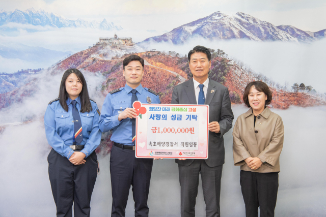 속초해양경찰서(서장:이우수) 직원 일동은 16일 고성군청 군수 집무실에서 사랑의 성금 100만원을 함명준 군수에게 기탁했다.