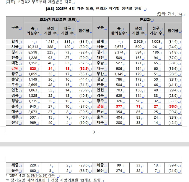 한의과의 경우 도내 한의원 등의 참여율은 38.0%였다. 강원지역 총 한의원 수 377곳 중 선정기관 수 71곳, 청구기관 수 27곳으로 총 98곳으로 확인됐다.