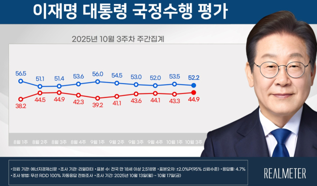 여론조사 전문기관 리얼미터가 에너지경제신문 의뢰로 지난 13일부터 17일까지 전국 만 18세 이상 유권자 2,518명을 대상으로 이재명 대통령 취임 20주 차 국정 수행 지지도를 조사한 결과 긍정 평가는 52.2%로 집계됐다. 세부적으로 매우 잘함이 40.9%, 잘하는 편이 11.2%였다.