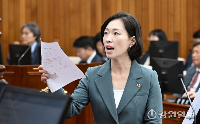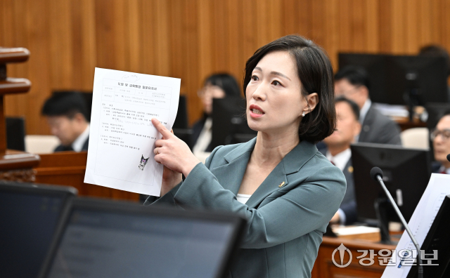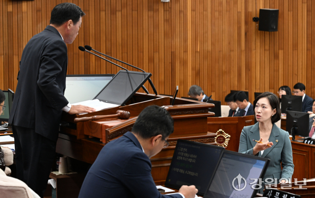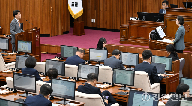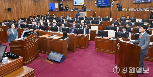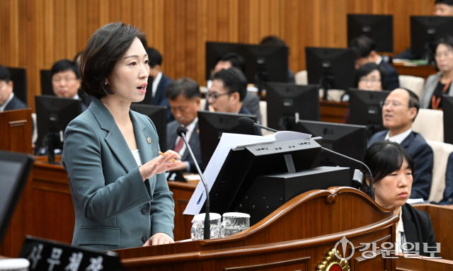 20일 강원특별자치도의회 본회의장에서 열린 제341회 임시회 제2차 본회의에서 진행된 2025년도 제3차 도정 및 교육행정에 관한 질문에서 이지영(더불어민주당·비례)의원이 김진태 강원자치도지사에게 강원특별자치도 출범 이후 도정 현안, 행정복합타운 조성 등에 관해 질의하고 있다.