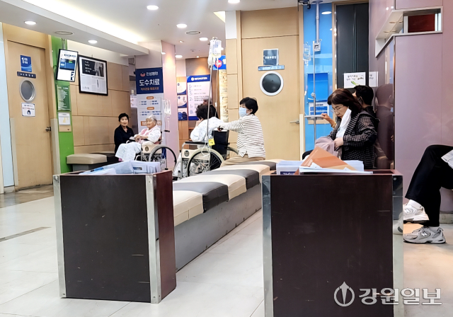 20일 오후 춘천 중앙로 인성병원에는 기침을 하며 마스크를 착용한 환자들이 10여평 규모의 대기실에 가득찼다. 월요일 오후임에도 진료실 앞에는 환자들이 줄지어 서 있었다.