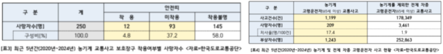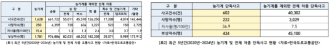 한국도로교통공단 교통사고분석시스템(TAAS)에 따르면 최근 5년간(2020~2024년) 농기계 교통사고는 1,628건, 이 중 사망자는 250명으로 집계됐다. 교통사고 100건당 사망자 수를 의미하는 치사율은 15.4로, 농기계를 제외한 전체 차종의 교통사고 치사율(1.4)의 11배에 달했다.
