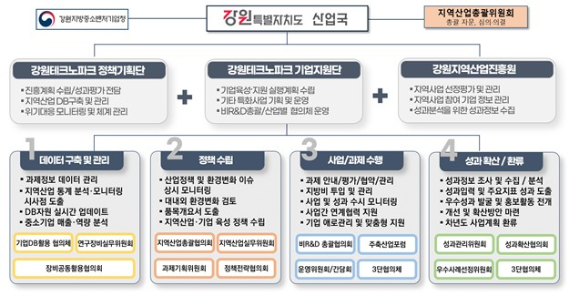이 같은 지역산업육성의 성과는 강원자치도가 민선8기 전략기획 체계에 따라 정책기획단(TP)–기업지원단(TP)–지역산업진흥원으로 구성된 ‘3단 협의체’ 중심의 연중 성과관리 체계를 운영한 결과로 분석된다. 성과관리위원회, 3단 협의체, 성과확산협의회 등 다양한 성과관리운영 시스템을 통해 기획–실행–성과분석–환류의 선순환 구조를 갖췄고, 이를 바탕으로 정책 실행력과 현장 대응력 모두에서 체계적인 구조를 갖게 됐다. 특히 지역 인구소멸 대응을 위해 기초지자체 및 지역혁신기관과의 협업으로 도내 산업 수요를 반영한 시군구연고산업 육성사업을 다수 기획해 눈길을 모았다. 2024~2025년 기준 총 9건의 과제를 수주하고, 국비 77.8억원을 확보했다.이는 데이터 기반의 정책기획 체계와 지역 협력 네트워크를 통해 정책 환류와 실질적 예산 확보를 동시에 실현한 대표 사례로 평가된다.