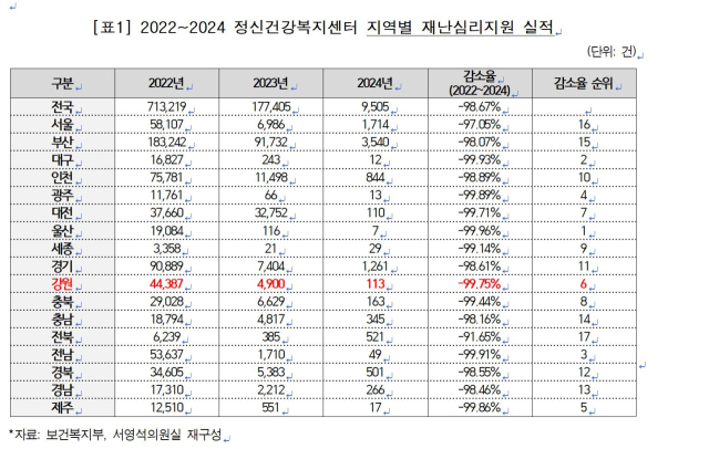강원지역 정신건강복지센터 지역별 재난심리지원 실적 건수는 2022년 4만4,387건, 2023년 4,900건이었지만 지난해 113건에 불과했다.