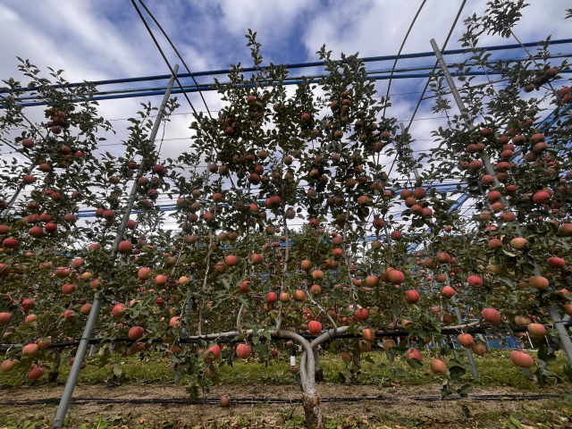 스마트농원에 들어서자 일반 과수원과는 전혀 다른 풍경이 펼쳐졌다. 보통 사과나무는 사방으로 가지가 퍼져 있지만 이곳 나무들은 가지가 평면으로 펼쳐져 마치 커튼을 연상케 했다. 200여 그루의 나무마다 빨간 사과가 층층이 달린 모습이 한눈에 들어왔다.
