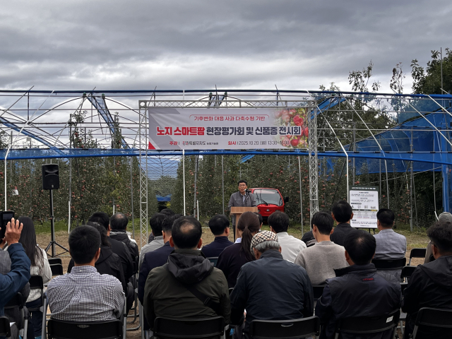 지난 21일 춘천시 동내면 사과 농가에서 열린 현장평가회에서는 연구 5년차에 접어든 ‘다축수평 기반 스마트팜’ 모델을 평가하고, 도내 농가 보급이 논의됐다.