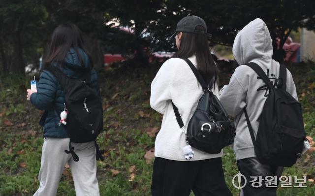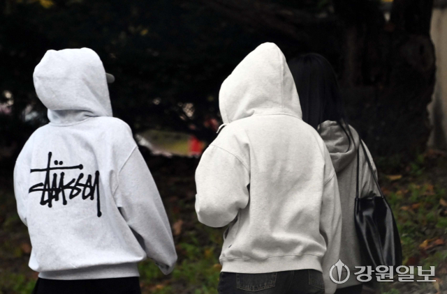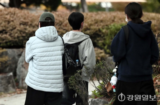 아침 최저기온이 전날보다 더 낮아지며 쌀쌀한 초겨울 날씨를 보인 21일 춘천시 효자동에서 두꺼운 옷을 입은 시민들이 몸을 움츠린 채 걷고 있다. 신세희기자