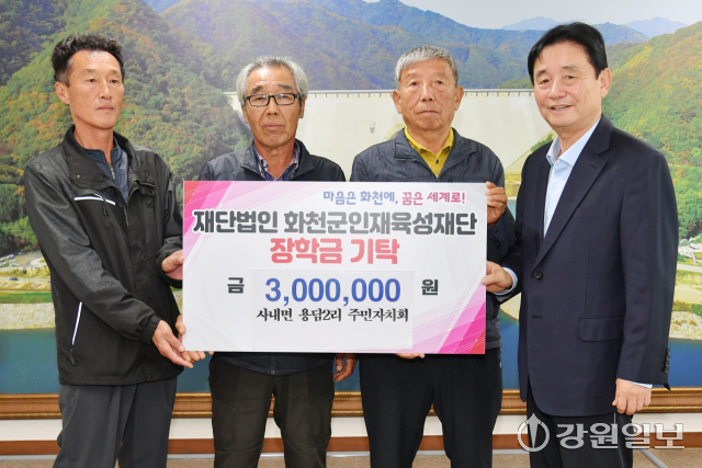 화천군 사내면 용담2리(이장:이규호) 주민자치회는 22일 최문순 화천군 인재육성재단 이사장에게 장학금 300만원을 기탁했다. 화천=장기영기자