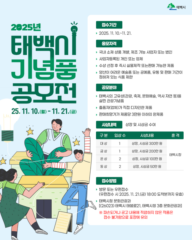 【태백】태백시가 지역의 문화와 자연, 먹거리, 관광명소 등 다양한 지역 자원을 활용한 창의적인 관광기념품을 발굴하기 위해 '2025년 태백시 관광기념품 공모전'을 개최한다.