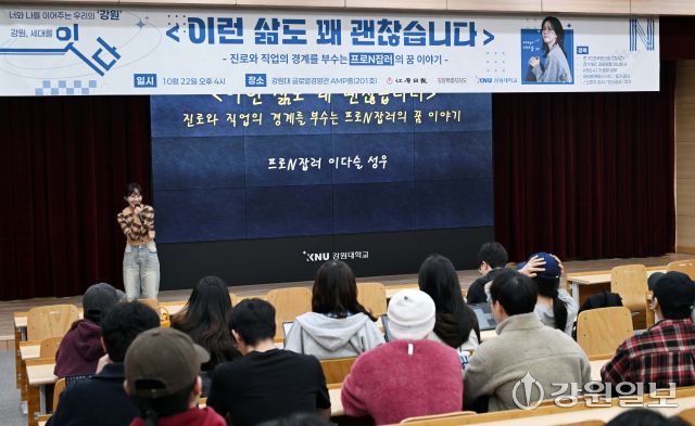 강원일보와 강원도, 강원대는 22일 강원대 글로벌경영관에서 이다슬 성우를 초청해 '이런 삶도 꽤 괜찮습니다 - 진로와 직업의 경계를 부수는 프로 N잡러의 꿈 이야기' 를 주제로 특강을 실시했다.