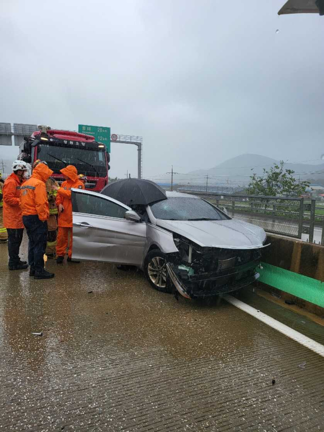 ◇22일 오전 8시43분께 삼척시 근덕면 7번 국도 인근에서 A(61)씨가 몰던 소나타 차량이 중앙분리대를 들이받았다. 사진=강원특별자치도소방본부 제공