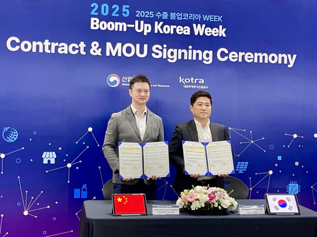 ㈜강원수출(대표: 함승우)은 지난 21일 고양시에서 열린 ‘2025 수출 붐업코리아 위크(WEEK)’에서 중국 후베이성 최대 수입식품 전문기업 ‘신상강’과 10년간 총 1,000만 달러(한화 약 143억원) 규모 장기 수출협약(MOU)을 체결했다.