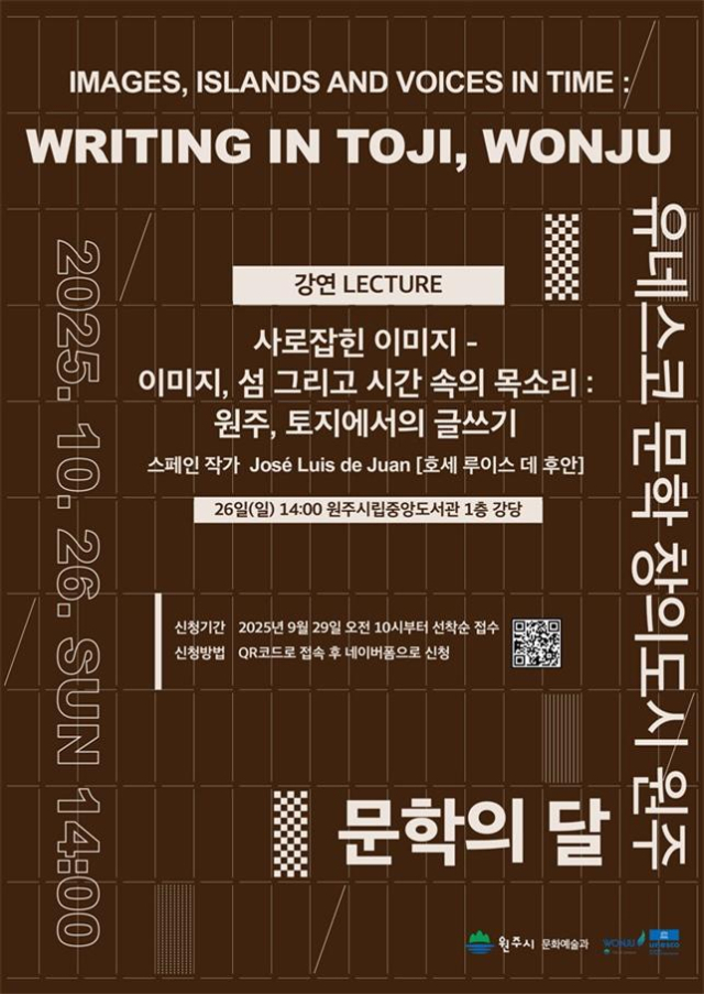 2025 원주 문학의 달 기념행사의 일환으로 마련된 행사다. 호세 루이스 데 후안은 '이미지, 섬 그리고 시간 속의 목소리:원주, 토지에서의 글쓰기'를 주제로 원주에서 집필하면서 느낀 한국의 문학적 풍경과 예술적 영감을 공유한다.