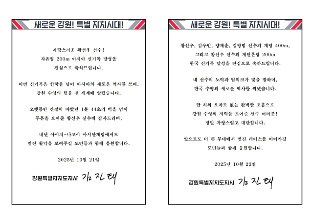하루 뒤 황선우, 김우민, 양재훈, 김영범이 함께 출전한 남자 일반부 계영 400m와 황선우의 개인 혼영 200m에서도 한국신기록이 탄생하자 다시 한 번 축하 메시지를 보냈다. 김 지사는 “네 선수의 노력과 팀워크가 빛을 발하며 한국 수영의 새로운 역사를 썼다”며 “한 치의 오차도 없는 완벽한 호흡으로 강원 수영의 저력을 보여준 선수들이 자랑스럽고 대단하다”고 강조했다. 이어 “앞으로도 더 큰 무대에서 멋진 레이스를 이어가길 도민들과 함께 응원하겠다”고 덧붙였다.