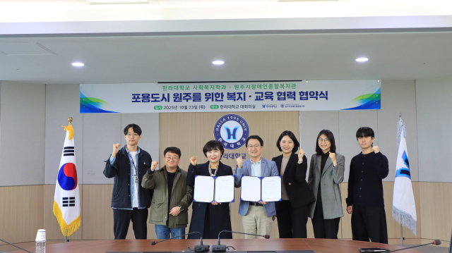 한라대(총장:김응권)는 최근 원주시장애인종합복지관과 포용적 도시 환경 조성과 지역사회 기여를 위한 교육협력체계 구축을 목표로 협약을 했다.