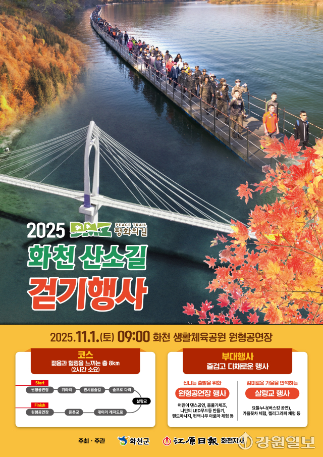 ◇화천의 가을을 만끽할 수 있는 2025년 화천군민 산소(O2)길 걷기행사가 오는 11월1일 오전 9시부터 북한강변 산소길에서 펼쳐진다. 사진은 지난해 산소길 행사 모습.◇화천의 가을을 만끽할 수 있는 2025년 화천군민 산소(O2)길 걷기행사가 오는 11월1일 오전 9시부터 북한강변 산소길에서 펼쳐진다. 사진은 지난해 산소길 행사 모습.◇화천의 가을을 만끽할 수 있는 2025년 화천군민 산소(O2)길 걷기행사가 오는 11월1일 오전 9시부터 북한강변 산소길에서 펼쳐진다. 사진은 지난해 산소길 행사 모습.