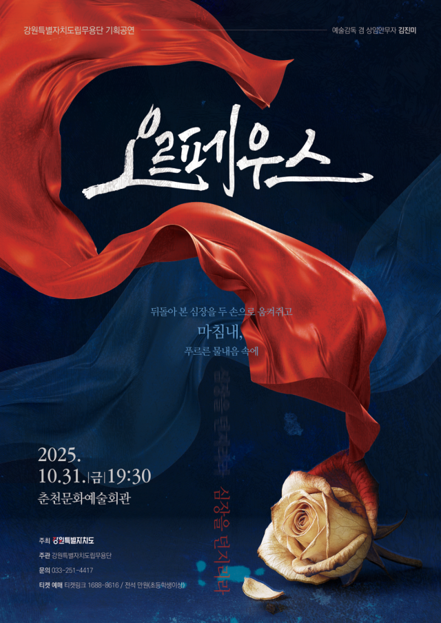 특히 이번 무대는 전통과 현대의 공존을 녹여내며 한국무용의 깊이와 넓이는 확장한다. 삶과 죽음의 경계에서 비극으로 치닫는 연인의 운명은 씻김굿의 회한의 몸짓으로 되살아나며, 흥부가의 놀부와 뺑덕도 등장해 인간의 욕망과 불안을 풀어낸다. 음악과 무대, 조명이 어우러진 무대 미학도 작품의 빼 놓을 수 없는 볼 거리다. 지난해 오르페우스로 취임 인사를 건넨 김진미 예술감독 겸 상임안무자는 “지난해 초연 이후 뜨거운 성원에 힘입어 다시 무대에 오르게 된 이번 앙코르 공연은 도립무용단의 예술적 깊이와 열정을 고스란히 담아낼 것”이라고 전했다. 공연은 전석 1만원으로, 티켓링크에서 예매할 수 있다. 문의는 (033)251-4417.