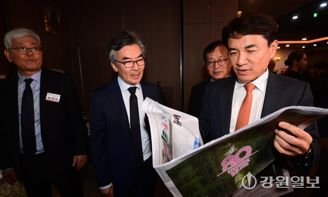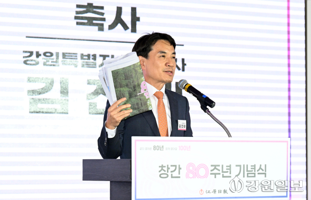 김 지사는 “매일 수십페이지 수백꼭지의 기사들을 만들어내는 강원일보 편집국과 기자들이 대단하다. 강원일보 없는 강원도보다 강원도 없는 강원일보를 택하겠다”면서 강원일보 창간 80주년을 축하.