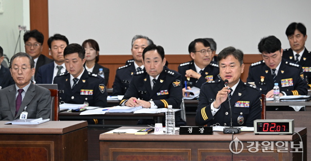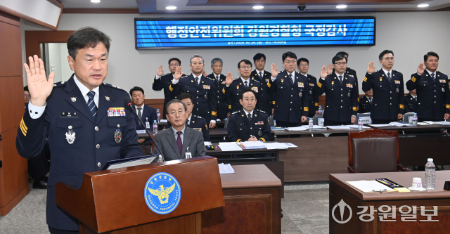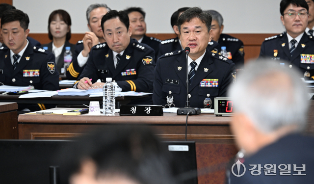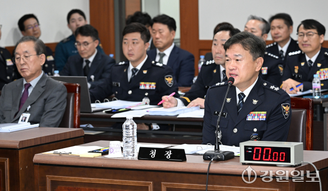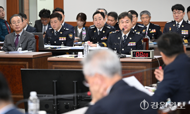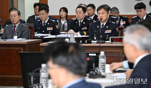 국회 행정안전위원회의 강원경찰청 현지 국정감사가 지난 24일 강원경찰청 대회의실에서 열렸다. 최현석 청장이 의원들의 질문에 답하고 있다.