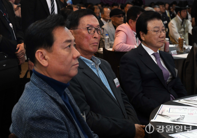 강원일보 창간 80주년 기념식이 열린 지난 24일 행사장에 모처럼 전직 강원도지사가 나란히 참석, 눈길을 끌었다.