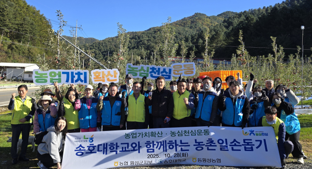 농협횡성군지부와 동횡성농협은 28일 송호대와 함께 청일면 농가에서 농협 임직원들과 대학 교직원 및 학생들이 참가한 가운데 사과 수확 및 영농폐기물 수거 등 농촌일손돕기 봉사활동을 벌였다.