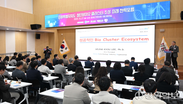 27일 춘천 ICT벤처센터에서 강원특별자치도, 강원테크노파크와 창간 80주년을 맞은 강원일보가 공동주최해 열린 ‘강원특별자치도 첨단바이오 클러스터 조성 미래 전략 포럼’에서 이승규 한국바이오협회 부회장은 ‘성공적인 바이오 클러스터 에코시스템(Bio Cluster Ecosystem)’에 대한 기조 강연에서 이같이 밝혔다.