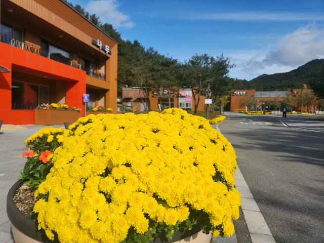 춘천숲체원 직원들이 27일 국립춘천숲체원 누리관 앞에 춘천시 시민꽃조성사업으로 직접 심은 노란 국화가 활짝 피어 가을 정취를 더하고 있다.
