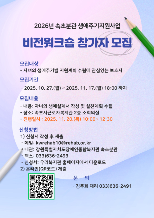 강원특별자치도장애인종합복지관은 다음달 17일까지 2026년 속초지역 생애주기지원사업을 위한보호자비전워크숍 참가자를 모집한다.