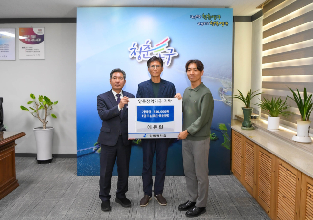 에듀런(회장:김진도)은 27일 양구군청을 방문해 양록장학금 56만6,000원을 서흥원 양구군수에게 전달했다.