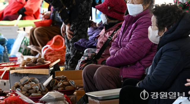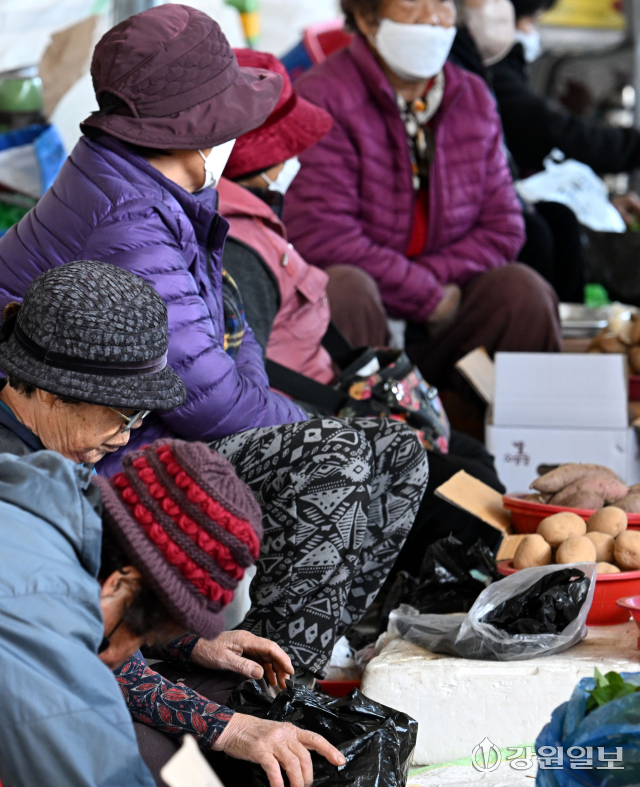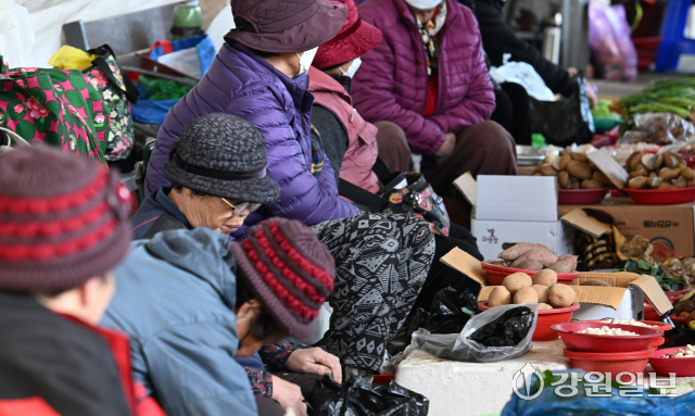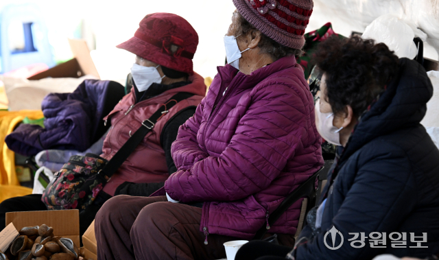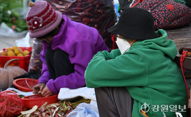 본격적인 가을 추위가 시작된 27일 춘천시 풍물시장에서 상인들이 두터운 겨울옷으로 중무장 한 채 손님을 기다리고 있다.