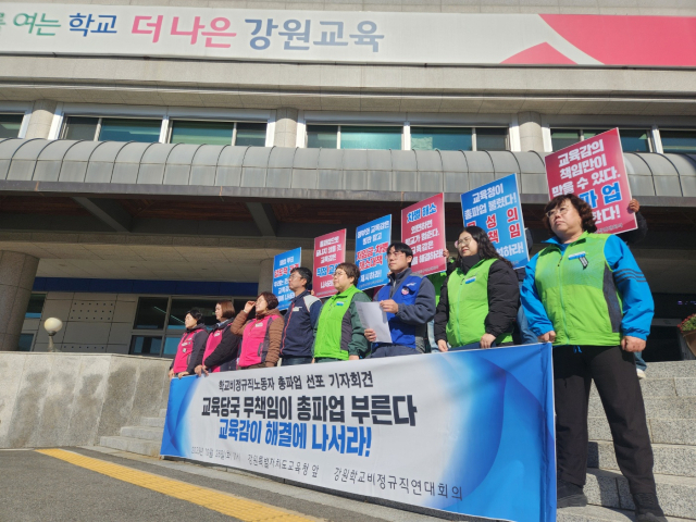 강원학교비정규직연대회의는 28일 강원도교육청 앞에서 기자회견을 열고 "전국 10만 조합원들이 합법적인 절차에 따라 쟁의행위 찬반 투표를 진행한 결과 91.8% 압도적 찬성률로 총파업을 결의했다"고 밝혔다. 강원권 투표율은 87%로 전국 평균(81.4%)을 웃돌고, 찬성률도 92.36%로 집계됐다.