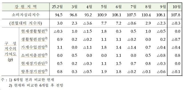 10월 강원지역 소비자심리지수(CCSI)는 107.8로 9월(108.1)보다 0.3포인트 내렸다. 지수는 지난 9월에 이어 두 달 연속 하락했으며 지난 7월(107.5) 이후 석 달 만에 최저 수준까지 떨어졌다.