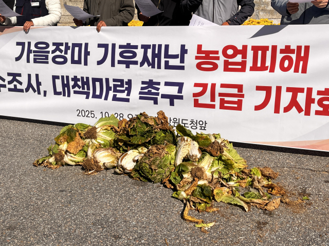 전국농민회총연맹 강원도연맹은 28일 강원특별자치도청 앞에서 기자회견을 열고 ‘도내 기후재난 농업피해 전수조사와 대책 마련’을 요구했다. 현장에는 무름병 피해로 잎이 썩어 갈변한 배추 한무더기가 놓여 있었다.