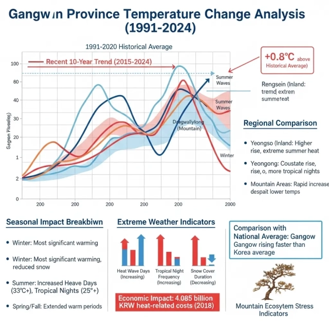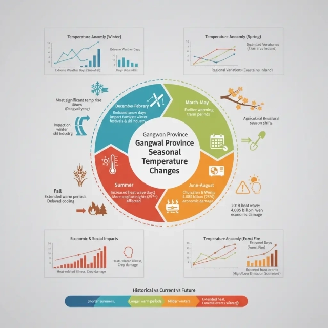 기후 대응에 실패한 경우(시나리오A:방치된 미래), 강원도의 연평균 기온은 현재보다 2.5도 이상 상승할 것으로 예측된다. 기온 상승은 단순한 날씨 변화가 아니라, 지역의 생태계와 경제 구조 전반에 영향을 미친다. 겨울철 적설일수는 절반 이하로 줄어 설경은 더 이상 강원의 일상을 구성하는 풍경이 아니게 된다. 평창, 정선 등 겨울 관광지의 스키장 운영일수도 대폭 줄어들며, 지역 경제는 타격을 입을 수밖에 없다. 여름은 훨씬 더 혹독해진다. 2045년이 되면 연간 폭염일수가 40일을 훌쩍 넘고, 열대야도 두 달 가까이 지속되는 기후 패턴이 일반화될 것으로 전망된다. 고온에 취약한 노약자들이 많은 농촌 지역에서는 폭염이 일상적 건강 위협이 되고, 냉방 비용 증가와 농작물 피해 등으로 경제적 부담도 커진다.