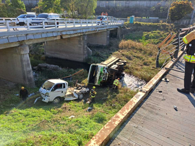 홍천에서 화물차 2대가 교량 밑으로 추락했다.