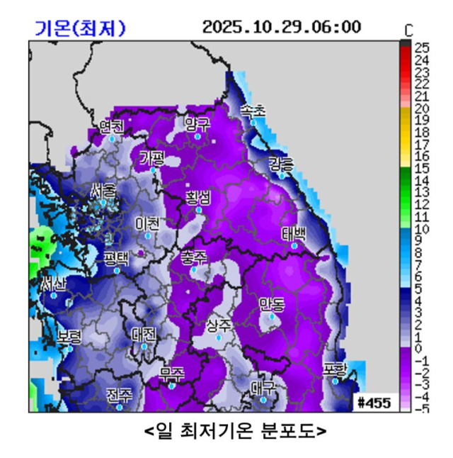 기상청에 따르면 이날 오전 6시 기준 주요지점 일최저기온 현황은 삽당령 영하 4.2도, 대관령 영하 4도, 삼척(하장) 영하3 .2도, 화천(사내) 영하 2.2도 원주 영하 2.0도, 강릉(주문진) 2.6도 등의 기온분포를 보였다.