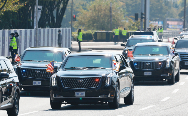 후미에는 미국 측 경호 차량 수십 대가 뒤따랐다. ‘더 비스트’ 3대는 행렬 중간에 위치했으며, 차량 양쪽에는 한국과 미국 국기가 나란히 꽂혀 있었다.