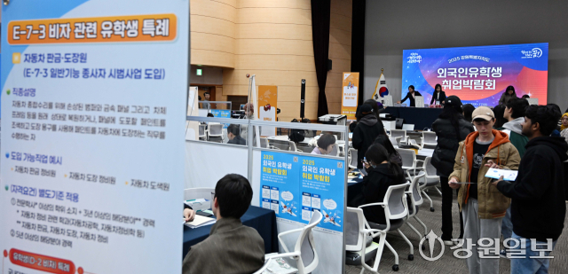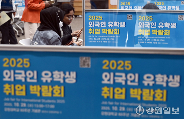 29일 강원대 춘천캠퍼스에서 열린 외국인 유학생 취업박람회를 찾은 유학생들이 각 기업 부스를 찾아다니며 구직활동하고 있다.