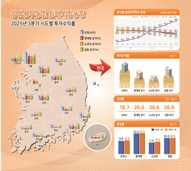 한국부동산원이 30일 발표한 ‘2025년 3분기 상업용부동산 임대동향조사 결과’에 따르면 올 3분기 도내 오피스 상가 공실률은 23.7%로 집계됐다. 이는 이는 전국 평균 공실률(8.9%)보다 2배 넘는 수준으로, 충북(31.5%), 경북(24.9%) 다음으로 전국에서 세 번째로 높게 나타났다.