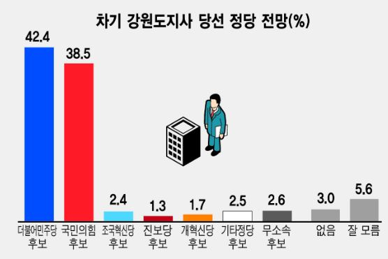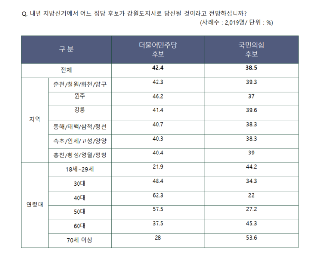 '내년 지방선거에서 어느 정당의 후보가 강원도지사로 당선될 것이라고 전망하는가'라는 질문에 응답자의 42.4%가 더불어민주당을, 38.5%가 국민의힘을 선택했다. 양 정당의 격차는 3.9%포인트로 오차범위 이내다.