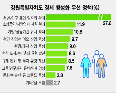 이번 조사에서 '강원특별자치도의 경제활력을 위해 가장 필요한 정책은 무엇인가'라는 질문에 응답자의 27.6%가 '지역 청년·인구 유입을 위한 일자리 확대'를 꼽았다. 해당 응답은 도시지역인 원주(23%)와 강릉(24.2%)보다 농촌지역인 동해-태백-삼척-정선(31.2%)과 홍천-횡성-영월-평창(31%) 등에서 상대적으로 높았다. 수도권과의 접근성이 낮고 개발이 덜 이뤄진 지역일수록 일자리 창출을 좀 더 중요하게 인식하는 것으로 보인다.