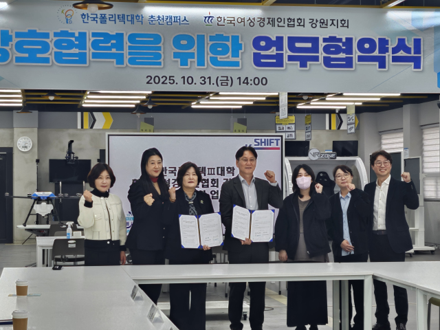 한국여성경제인협회 강원지회(회장:신지용)는 한국폴리텍Ⅲ대학 춘천캠퍼스(학장: 지경배)와 지난 10월31일 춘천폴리텍대학 1캠퍼스 열린융복합실습지원센터에서 ‘우수 인재 육성 및 지원을 위한 상호 협력 업무협약’을 체결했다. 양 기관은 이번 협약을 계기로 지역 여성기업과 기술인재 간의 연계 강화, 현장 중심 교육 확대 등 실질적인 협력에 나선다.
