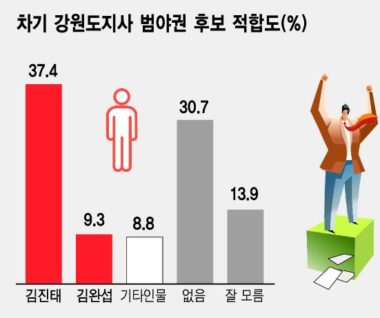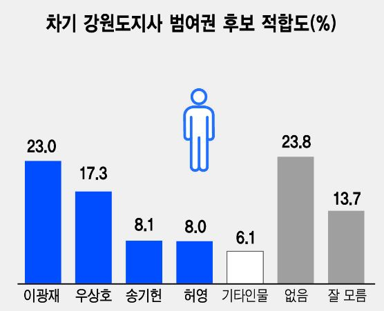 송기헌(원주을) 국회의원은 8.1%, 허영(춘천갑) 의원은 8.0%로 한 자릿수를 기록해 사실상 이 전 지사와 우 수석 의 대결이 될 것이라는 전망이 나온다.