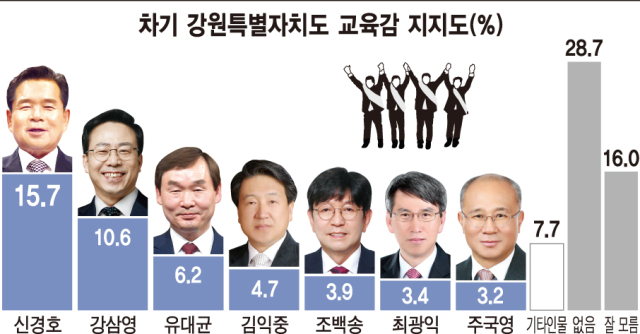 창간 80주년을 맞은 강원일보가 여론조사 전문기관인 ㈜리얼미터에 의뢰해 지난달 31일부터 지난 1일까지 강원도내 만 18세 이상 남녀 2,019명을 대상으로 '강원특별자치도교육감 선거 출마가 거론되는 인물 중 누구를 가장 지지하느냐'고 물은 결과(표본오차 95% 신뢰수준에 ±2.2%포인트), 응답자 중 15.7%가 신경호 현 교육감을 선택했다.
