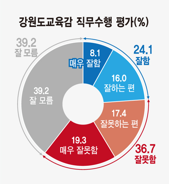 신경호 현 강원도교육감의 직무수행에 대한 평가를 묻는 질문에 응답자 중 36.7%(매우 잘못함 19.3%, 잘못하는 편 17.4%)가 부정적으로 평가했다. '잘하고 있다'는 긍정 평가는 24.1%(매우 잘함 8.1%, 잘하는 편 16.0%)으로 집계됐다. 12.6%포인트 차이다.