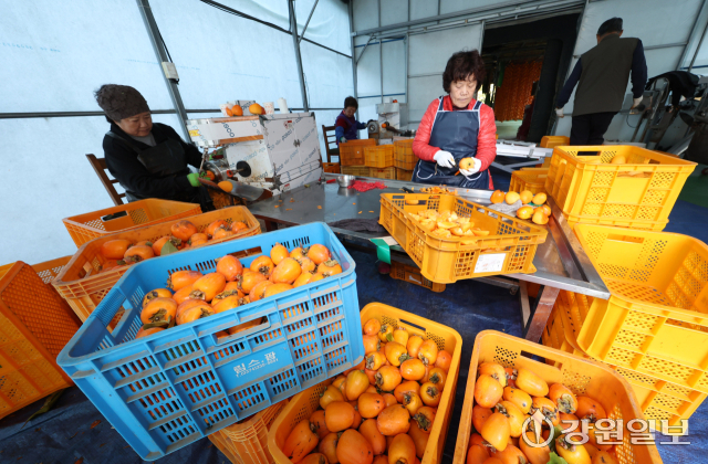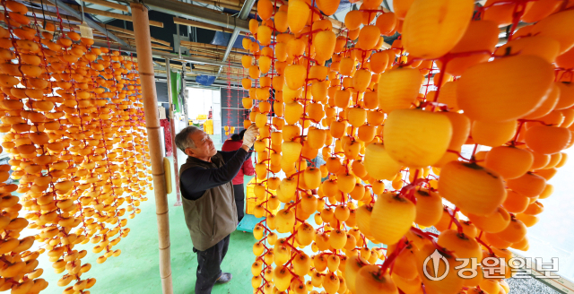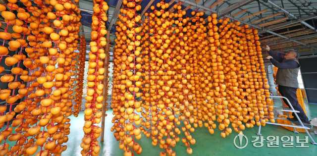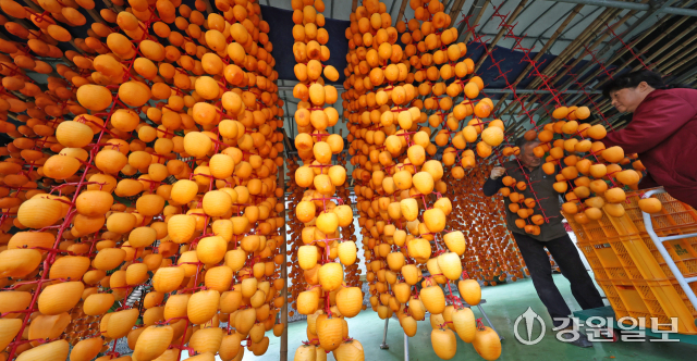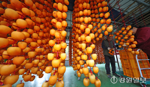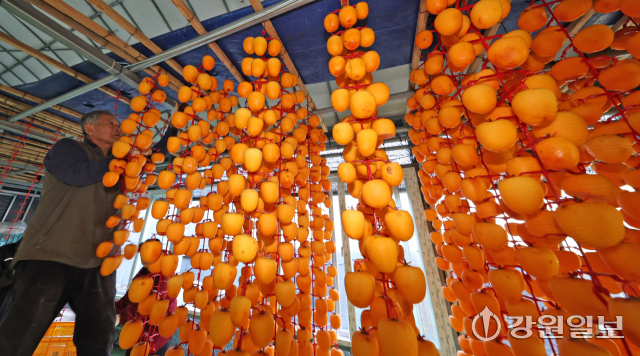겨울의 시작을 알리는 입동(立冬)을 앞두고 5일 강릉시 구정면 우리들농원 곶감덕장에서 주민들이 주홍빛 감을 정성스럽게 매달고 있다.