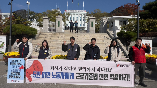 민주노총 강원지역본부는 4일 강원특별자치도청 앞에서 ‘5인 미만 사업장 노동자 근로기준법 전면 적용’을 촉구하는 첫 선전전을 진행했다.